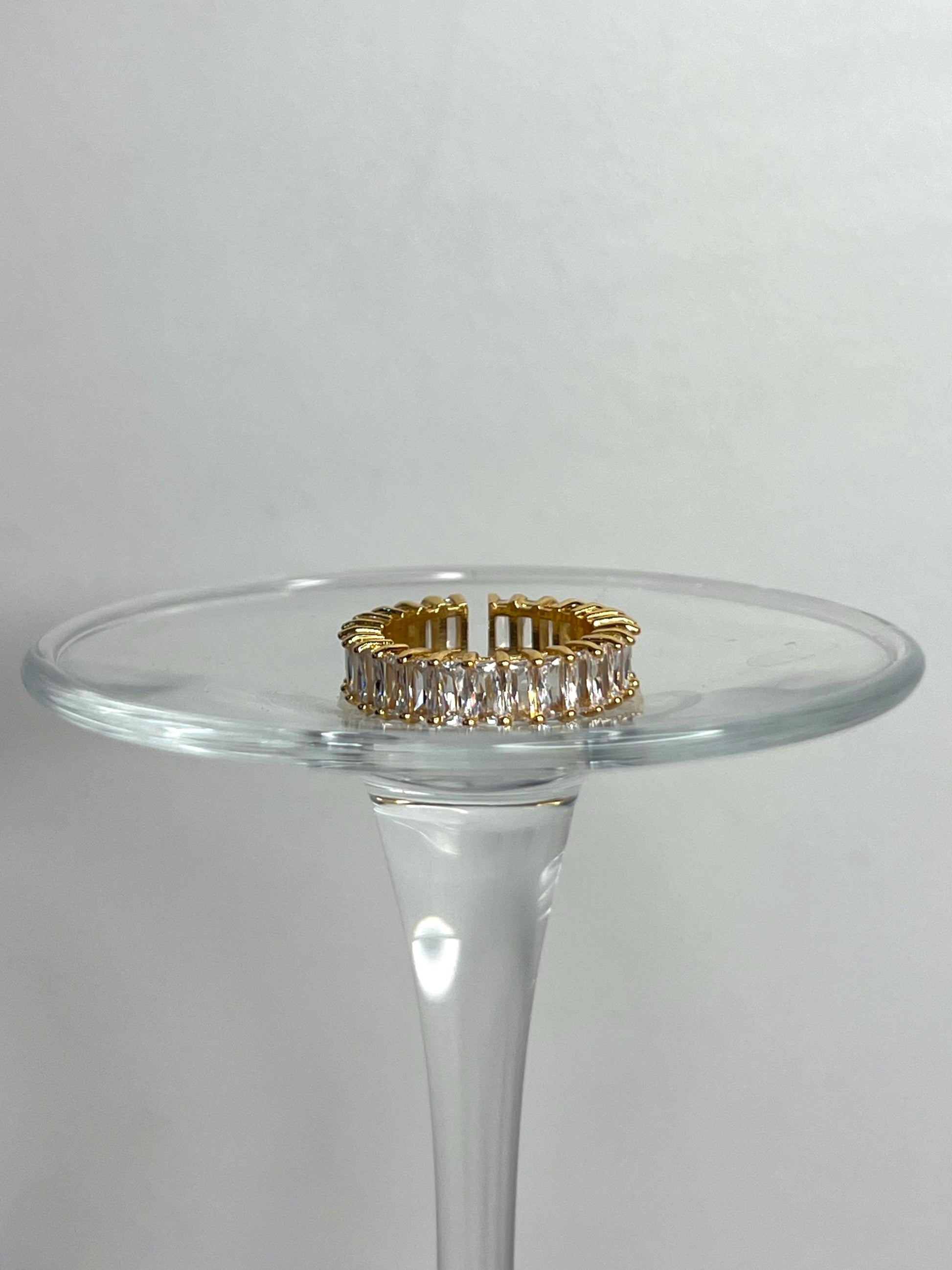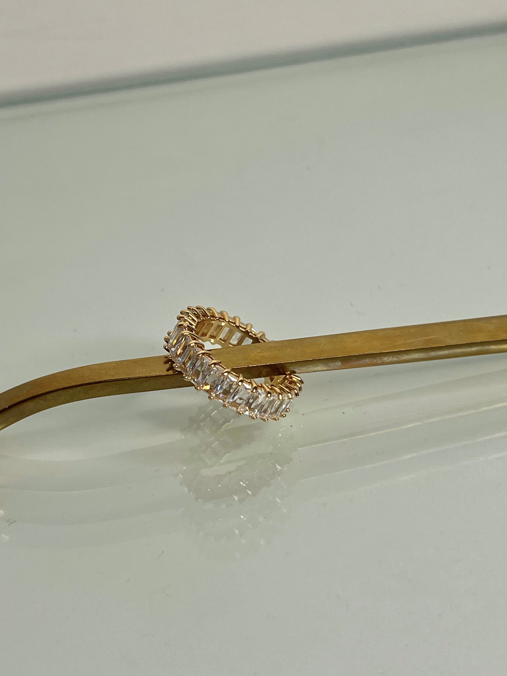 Avalon ring is a luxurious gold ring with baguette-cut stones. This aesthetic beauty is perfect for making a statement at parties and can be styled with gowns. dresses and jumpsuits.
