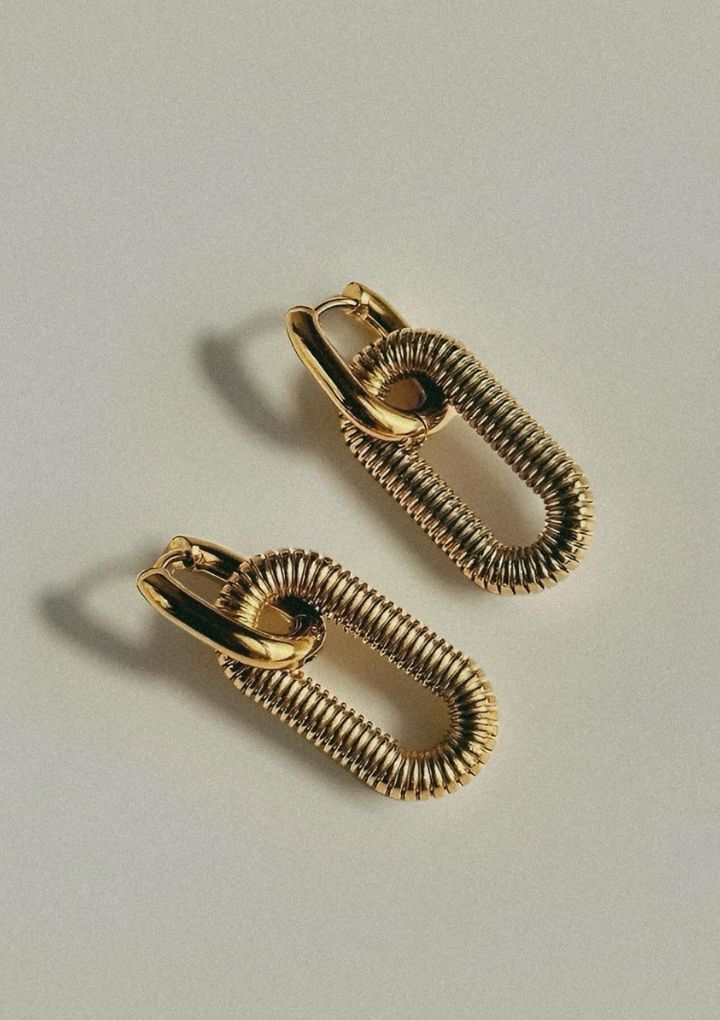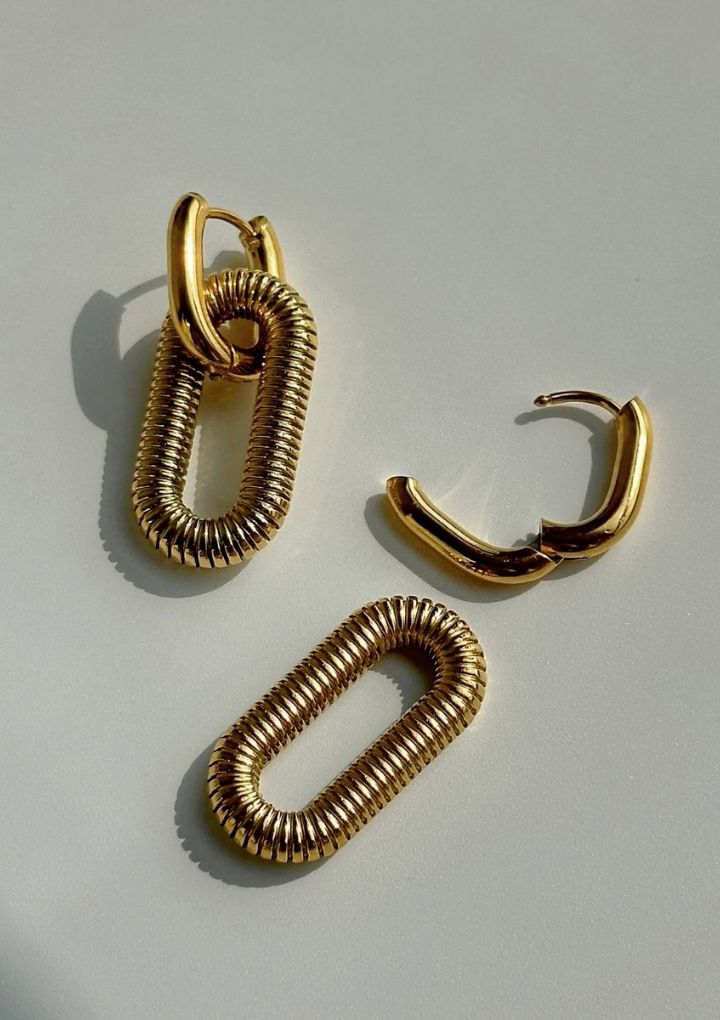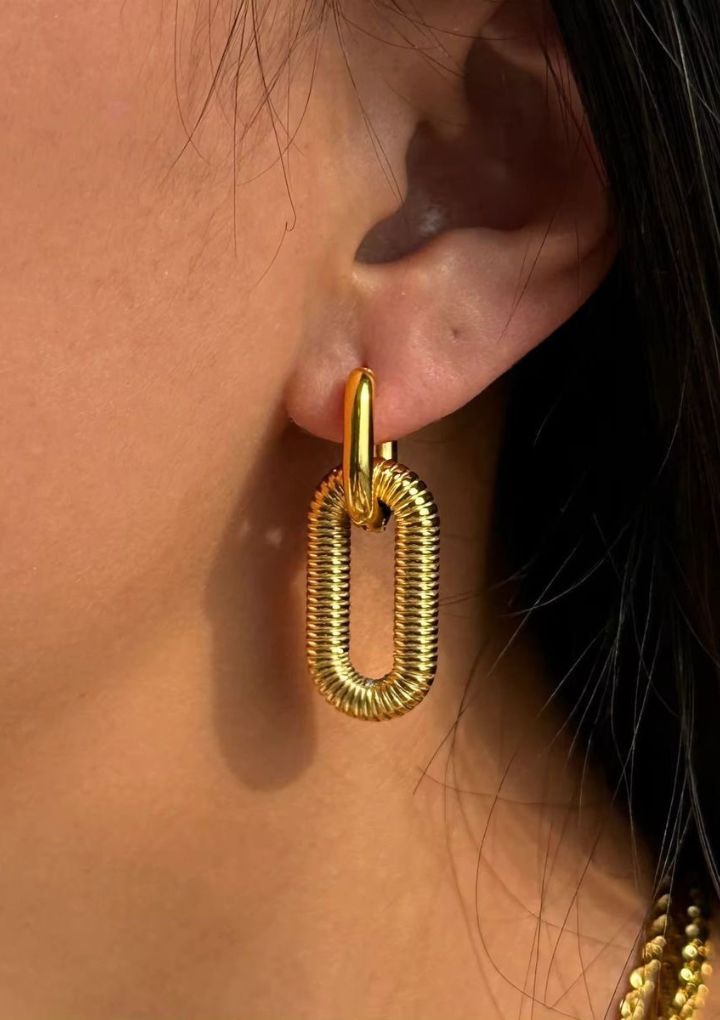 Our Benedict earrings feature a polished gold hoop that gently holds a ribbed, elongated oval charm. They are trendy and designed to turn heads. Perfect for corporate events or a day at the mall.
