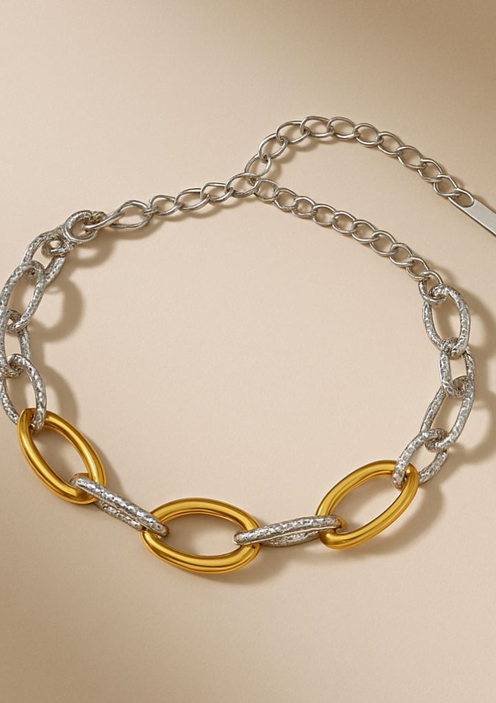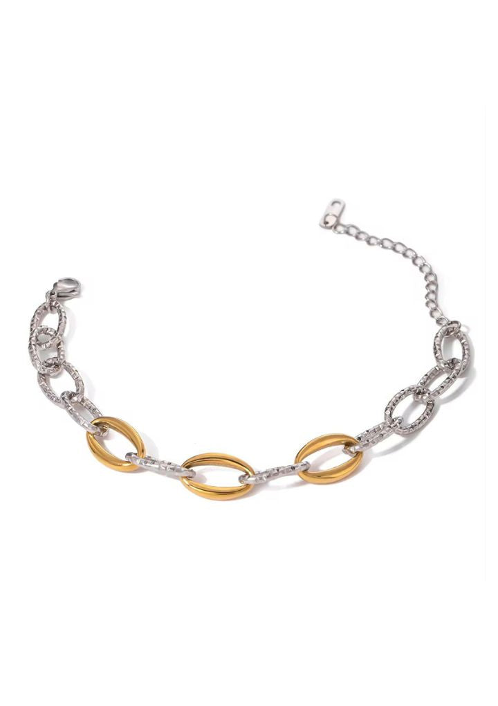 This is a bold two-tone bracelet with textured silver links and sleek gold ovals, giving it a chain-like look. It is perfect for styling with tailored blazer or co-ord set to add a hint of boldness.