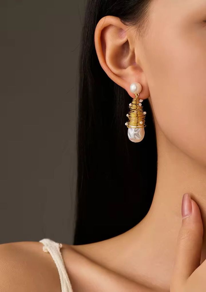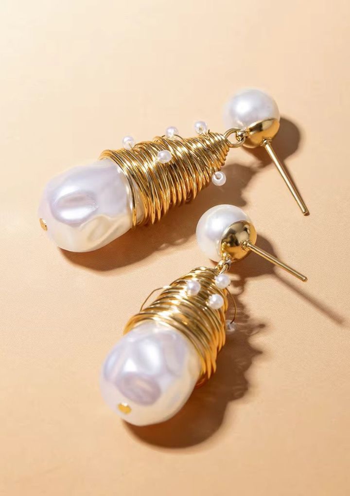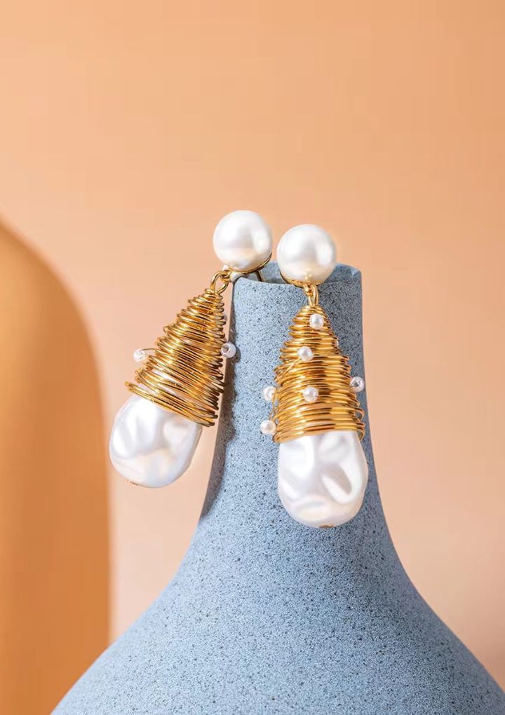These are cornetto shaped earrings with gold wire wrap and pearl stud tops. They are unique, classy and perfect for summertime styling.