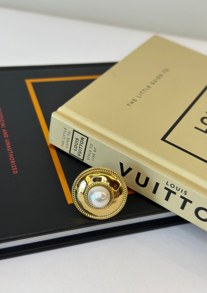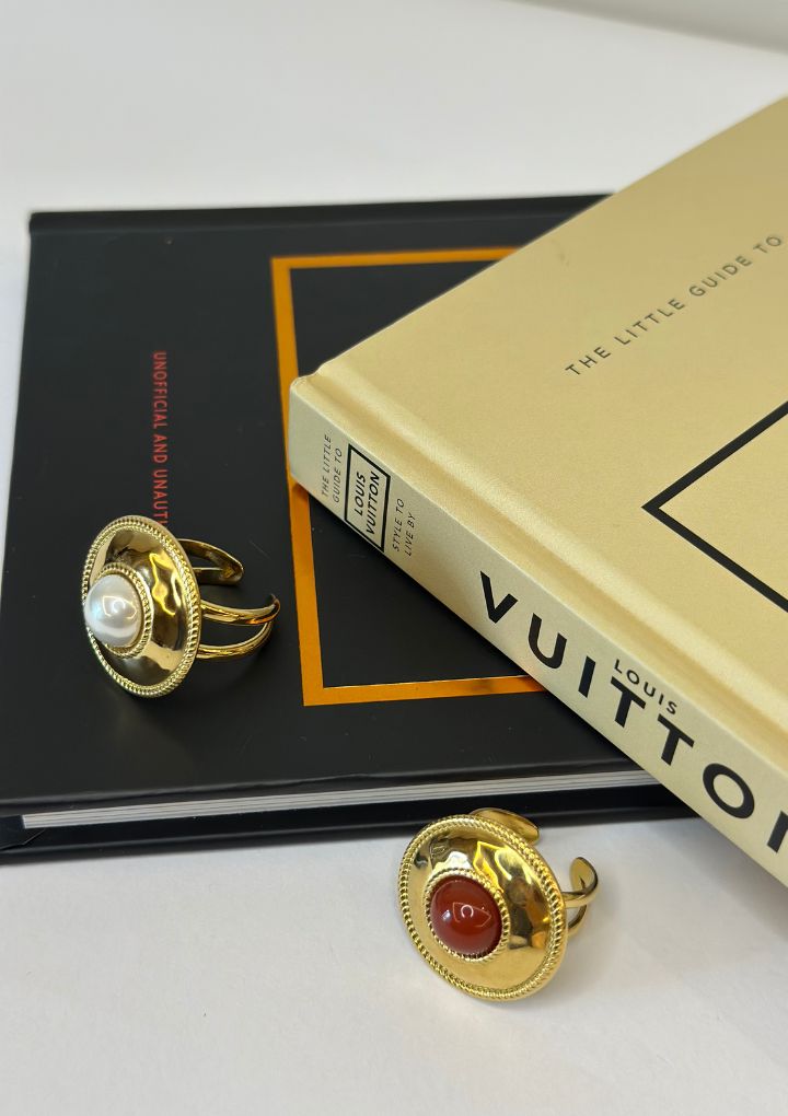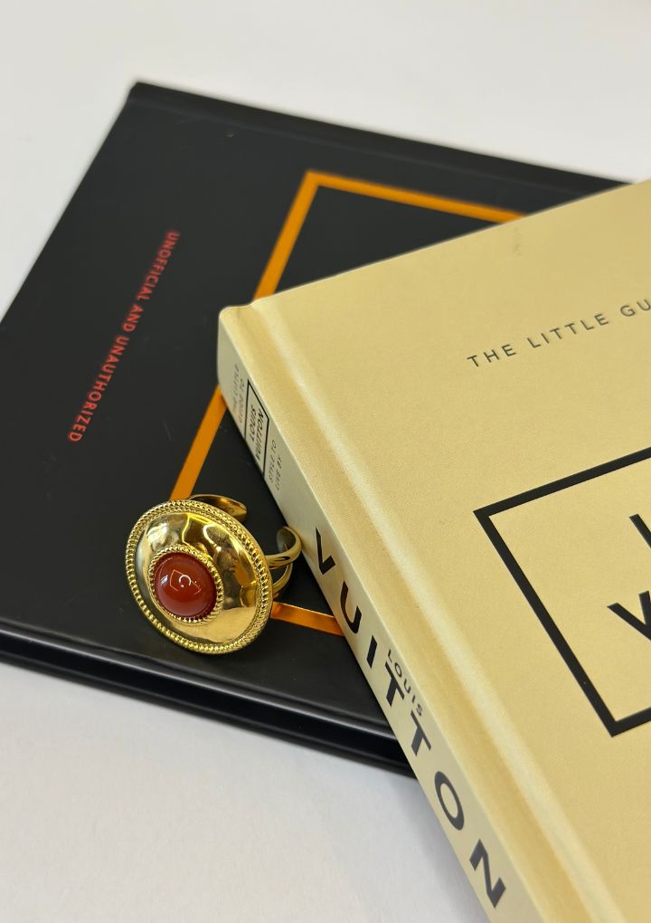 This is a bold vintage ring with beaded gold frame and coloured stone center. It is adjustable and perfect for festive occasions or bold vacation looks.
