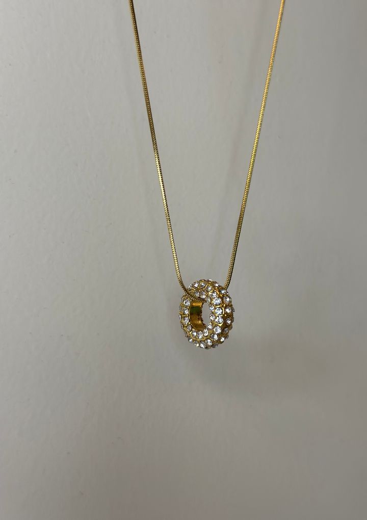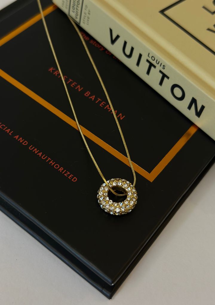Donut necklace is a gold-toned necklace with a sparkling, stone-studded circular pendant. This best-selling beauty is perfect for everyday elegance or evening outings.