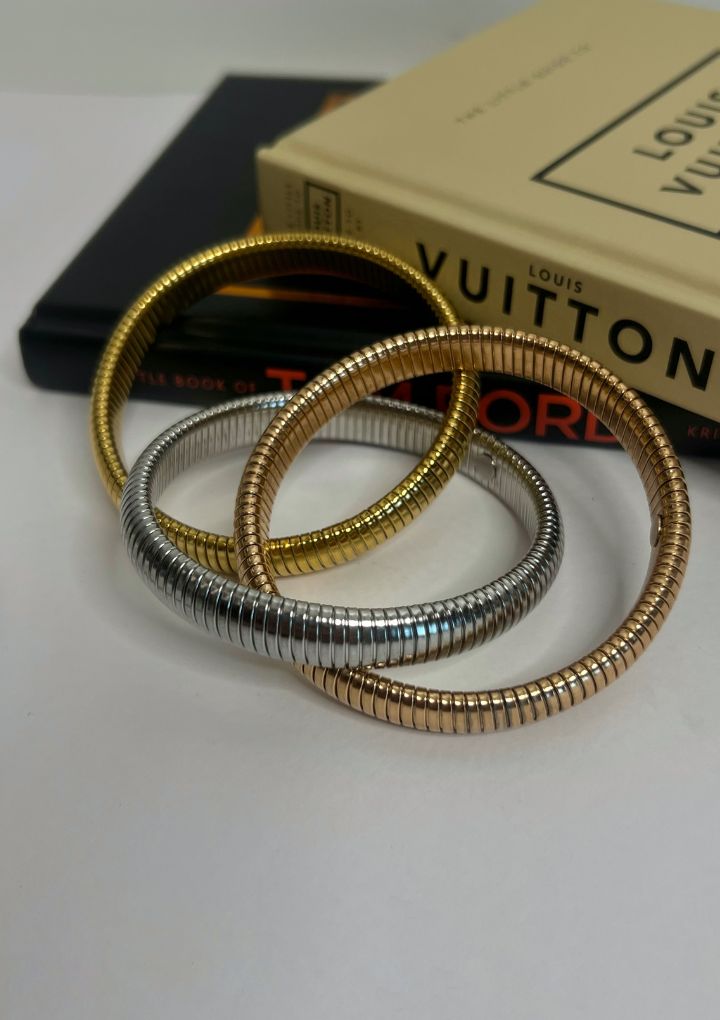 Our Enchanted triple band is a trio of coiled, flexible bangles in gold, silver, and rose gold with a sleek, ribbed finish. Perfect for shining bright in the day or stealing the spotlight at night.