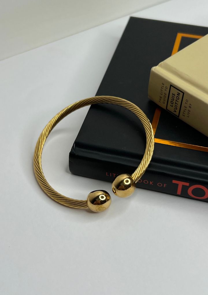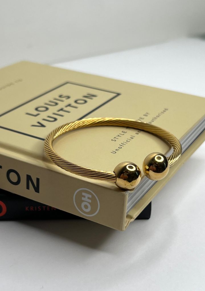 This is a bold twisted gold cuff featuring sleek polished ball ends. It is modern and minimal. Perfect for your daily casual looks.