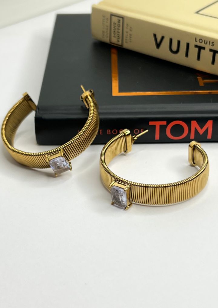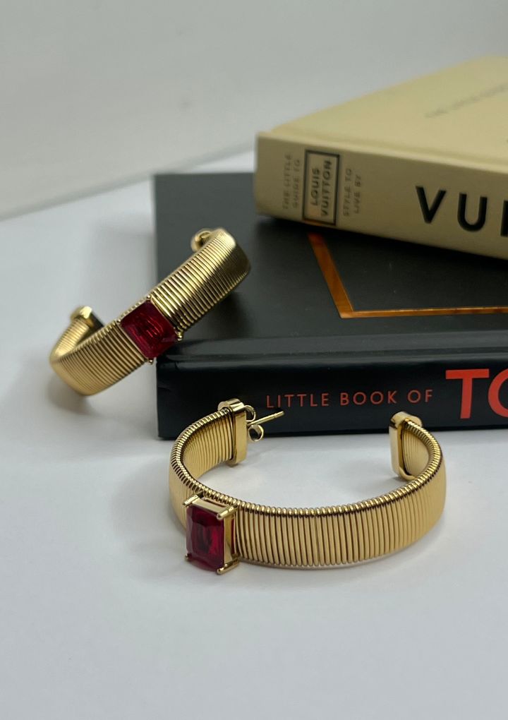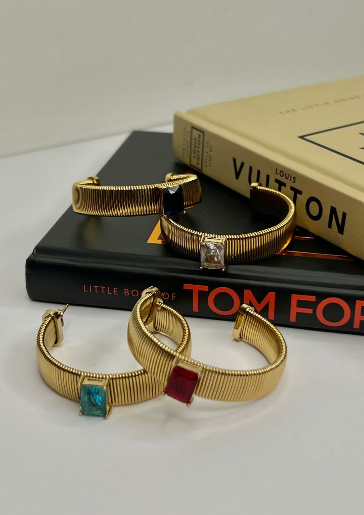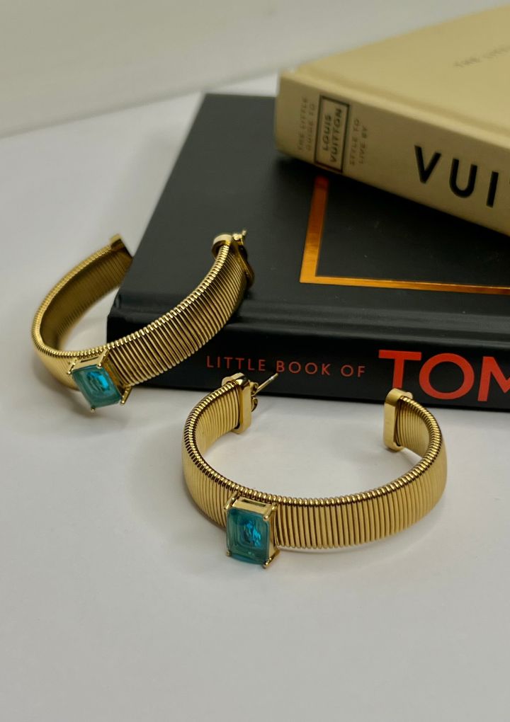 These are bold and stylish gold hoop earrings featuring a large gemstone at the center that add a vibrant pop of color, making these hoops perfect for making a statement. Perfect for cocktail parties and glam evening looks.