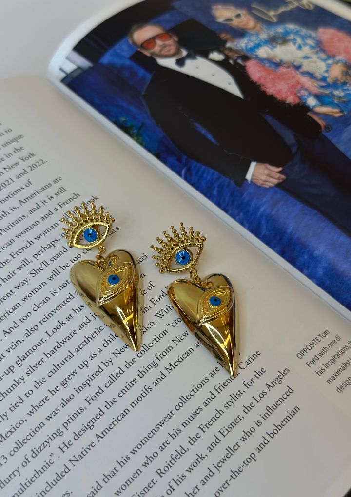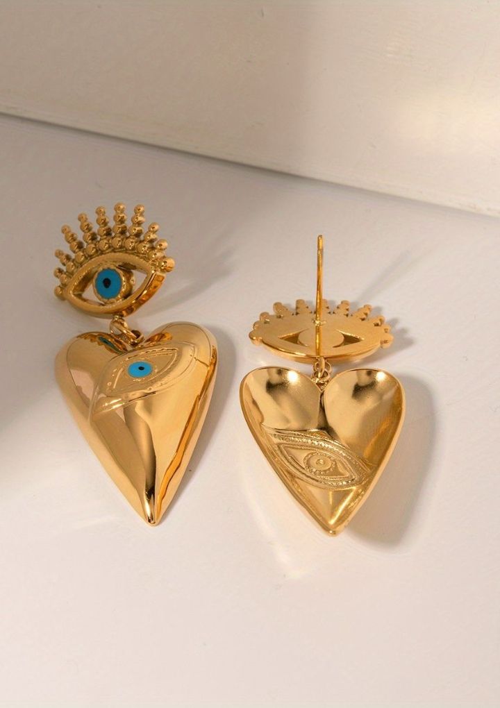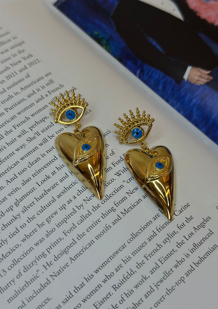 These gold-toned earrings feature bold, pointed heart drops paired with striking evil eye motifs and crown-like detailing. They are edgy, artsy, and perfect for artistic events or bold party looks.
