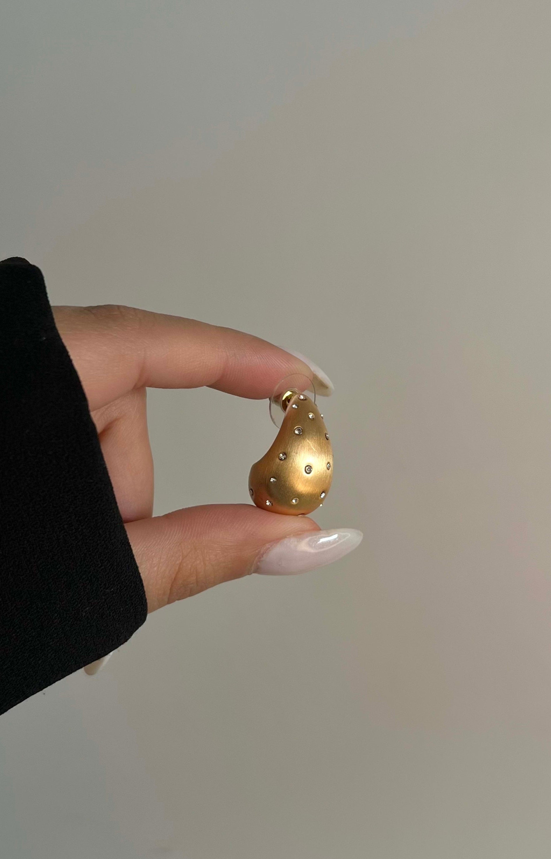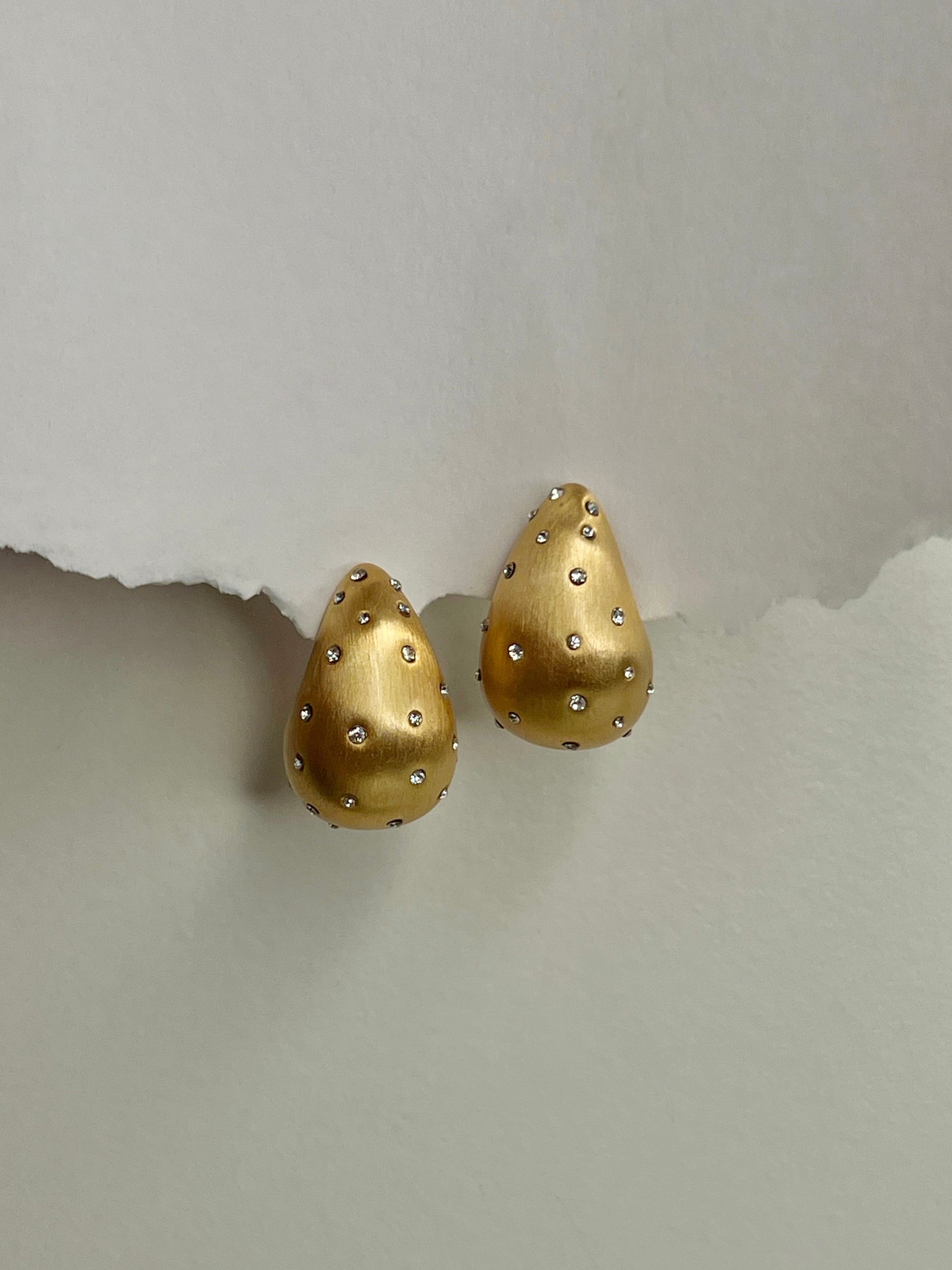 These earrings feature a soft teardrop shape with a matte gold finish, delicately dotted with tiny sparkling stones. Perfect to make a statement, whether in a power suit or an evening gown.