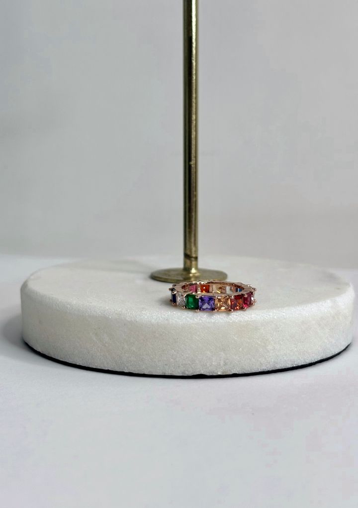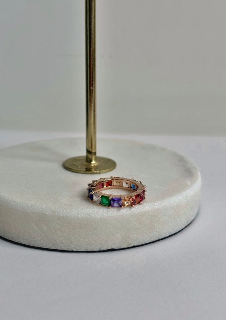 Jade ring is a rainbow-hued ring with square-cut gems set in rose gold. It is fun, vibrant and perfect for holiday stacking.