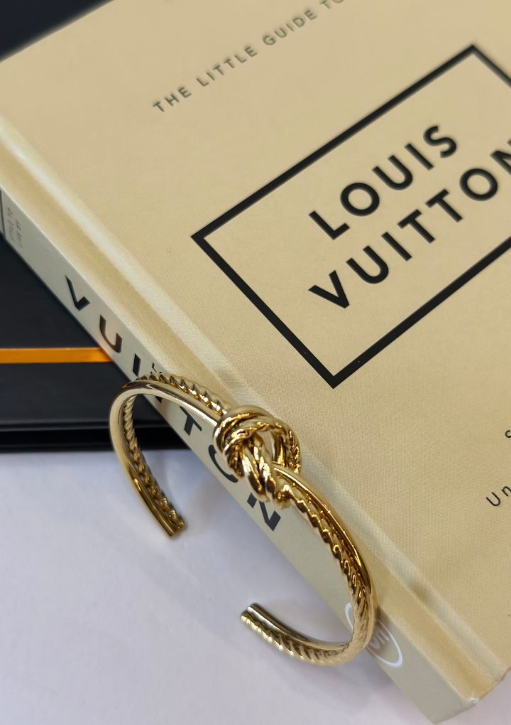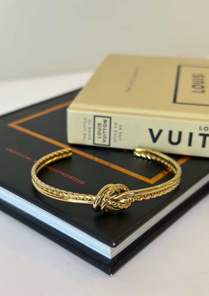This is a gold open cuff with rope detailing and a bold knot in the center. This stylish piece is perfect for gifting or making a statement at the lunch party.