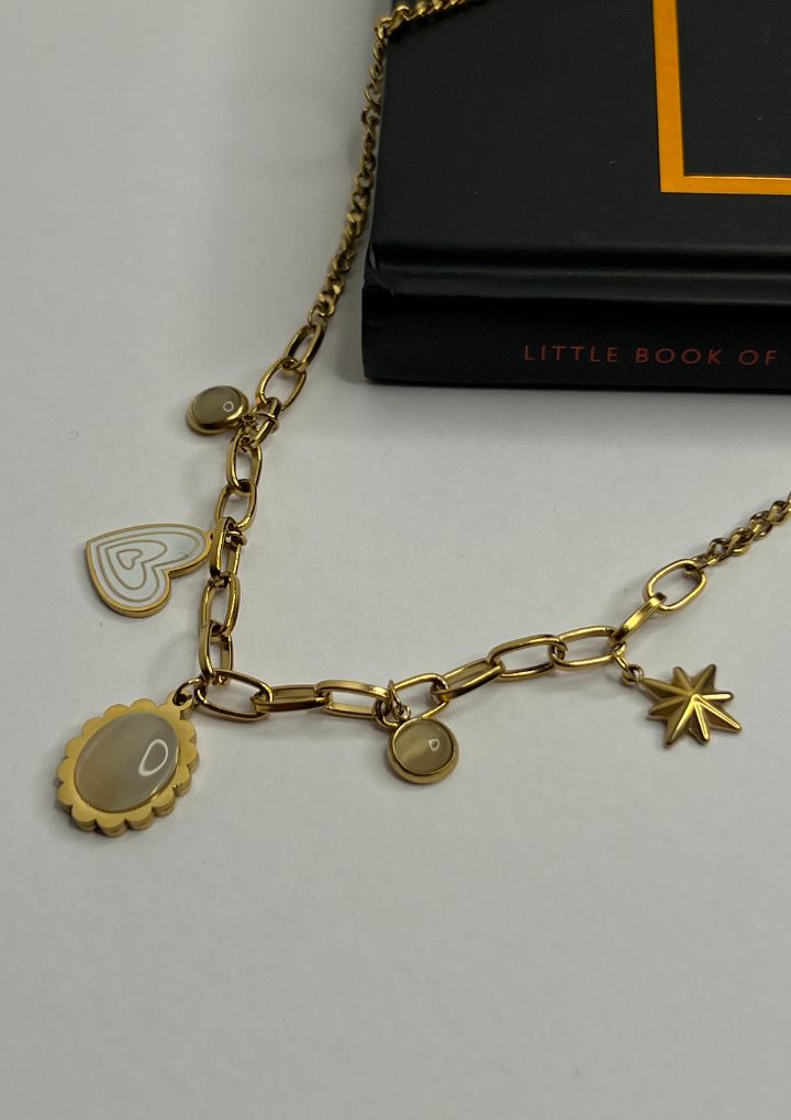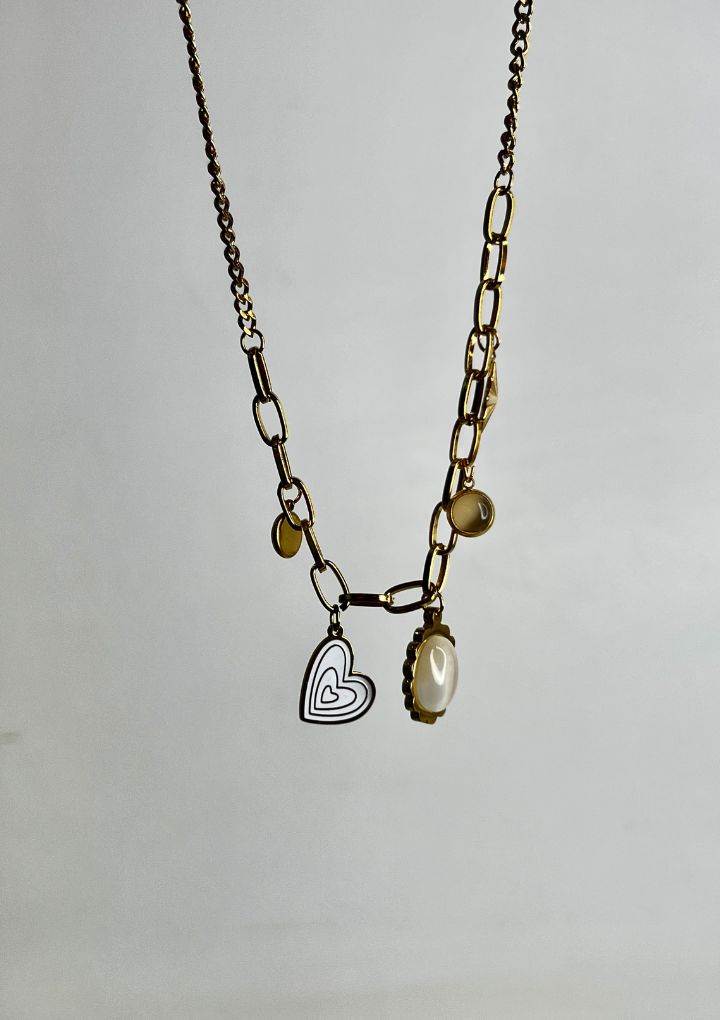 This is a chunky gold necklace with fun charms—a pearl-like bead, a heart, and small gold discs. Our love-bug necklace is super stylish and is perfect to wear with dresses or even simple shirts.