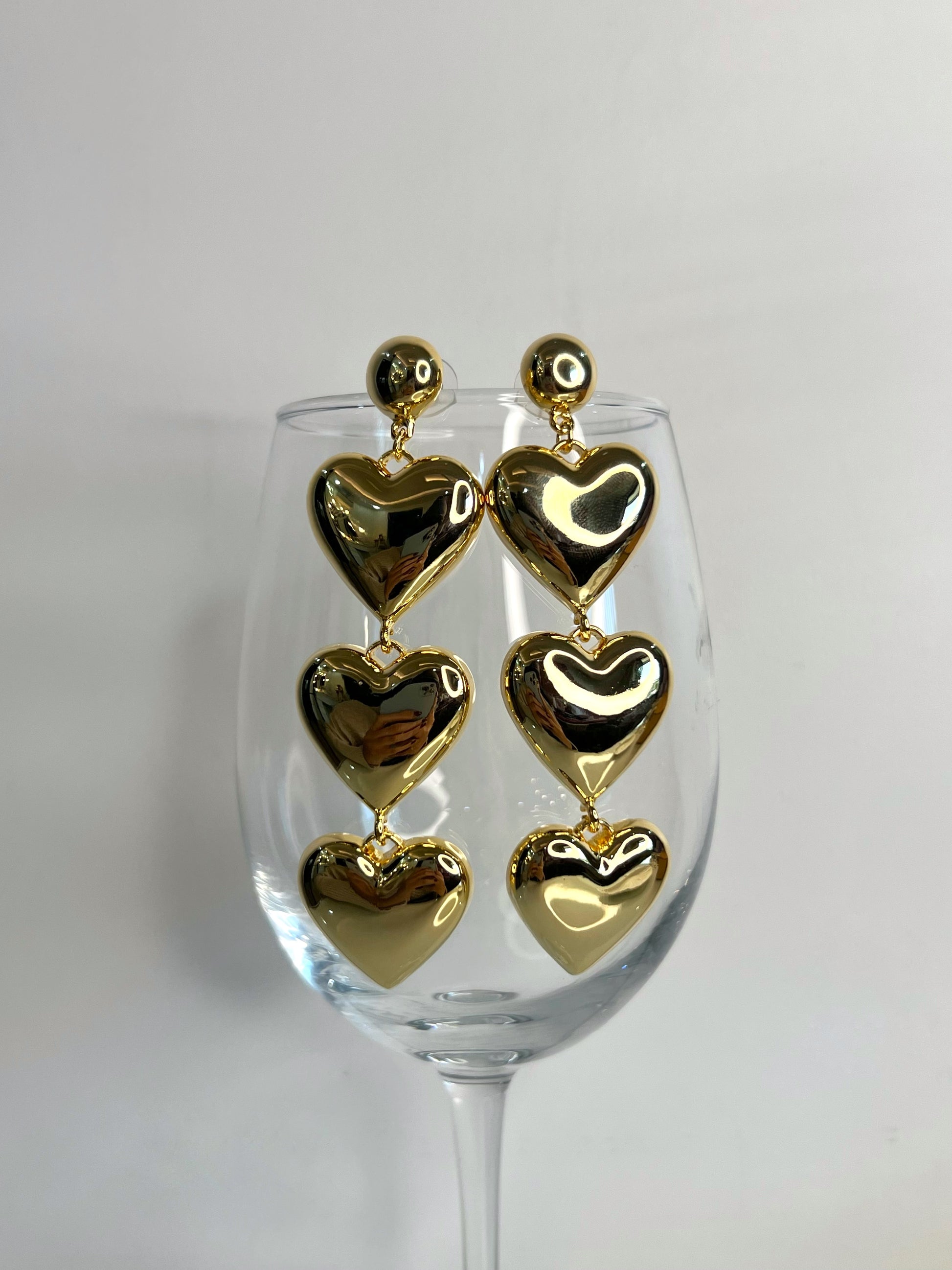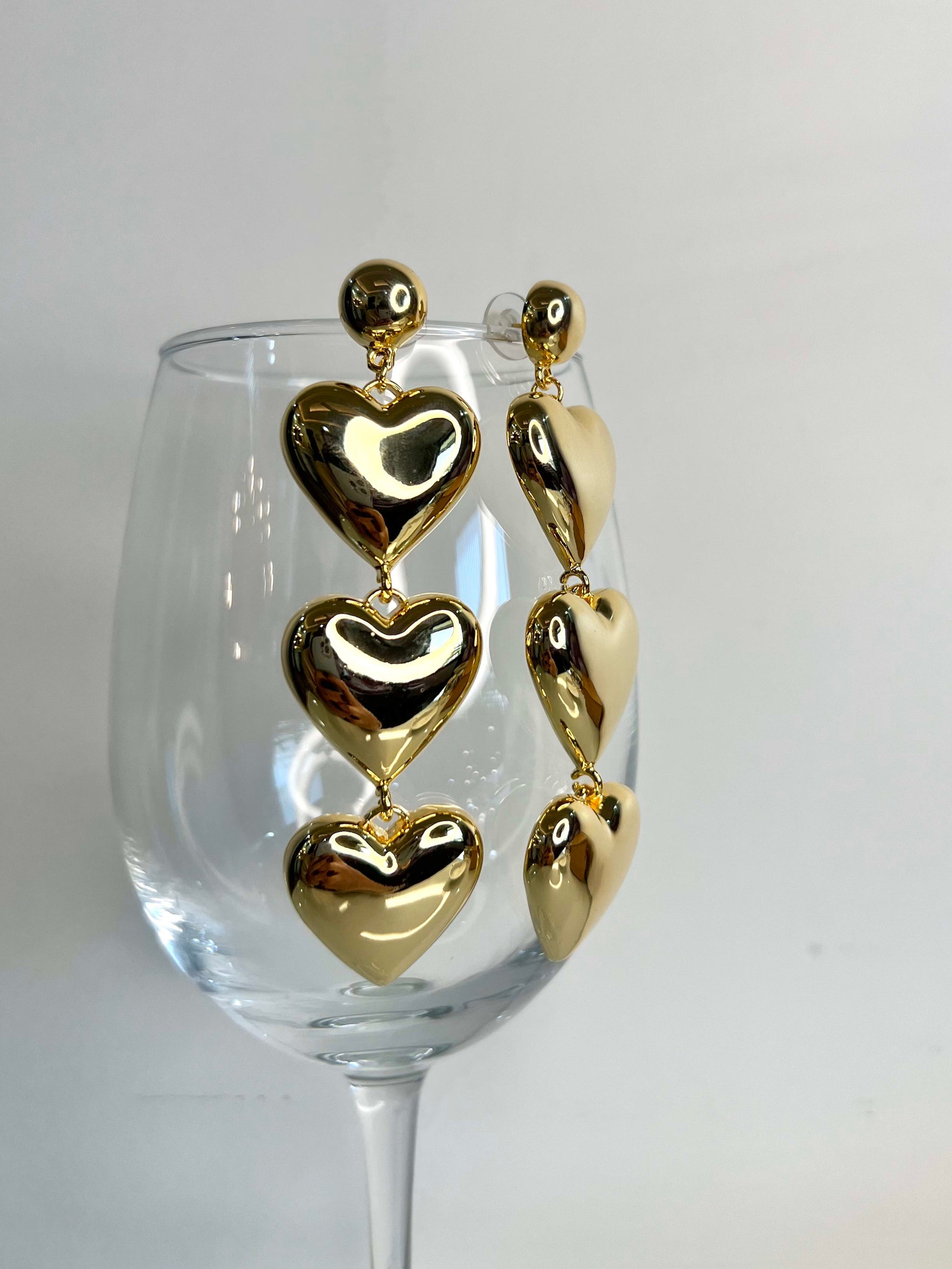 These gold earrings feature three cascading heart charms with a high shine finish. They are perfect for making a statement at parties and date nights.