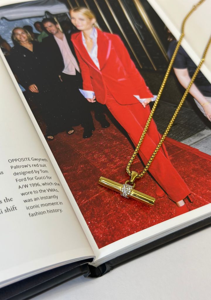 This is a gold chain with a horizontal bar pendant and a central cluster of sparkling stones. It is perfect for everyday elegance or minimalist evening wear.