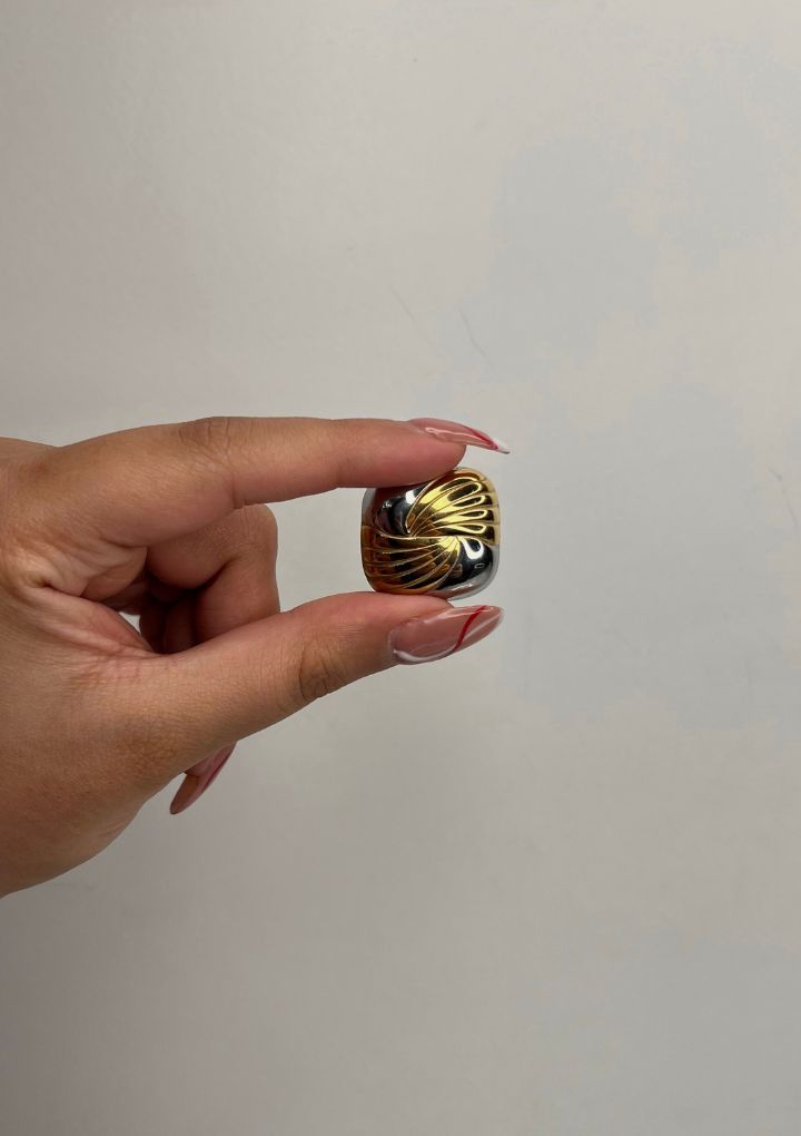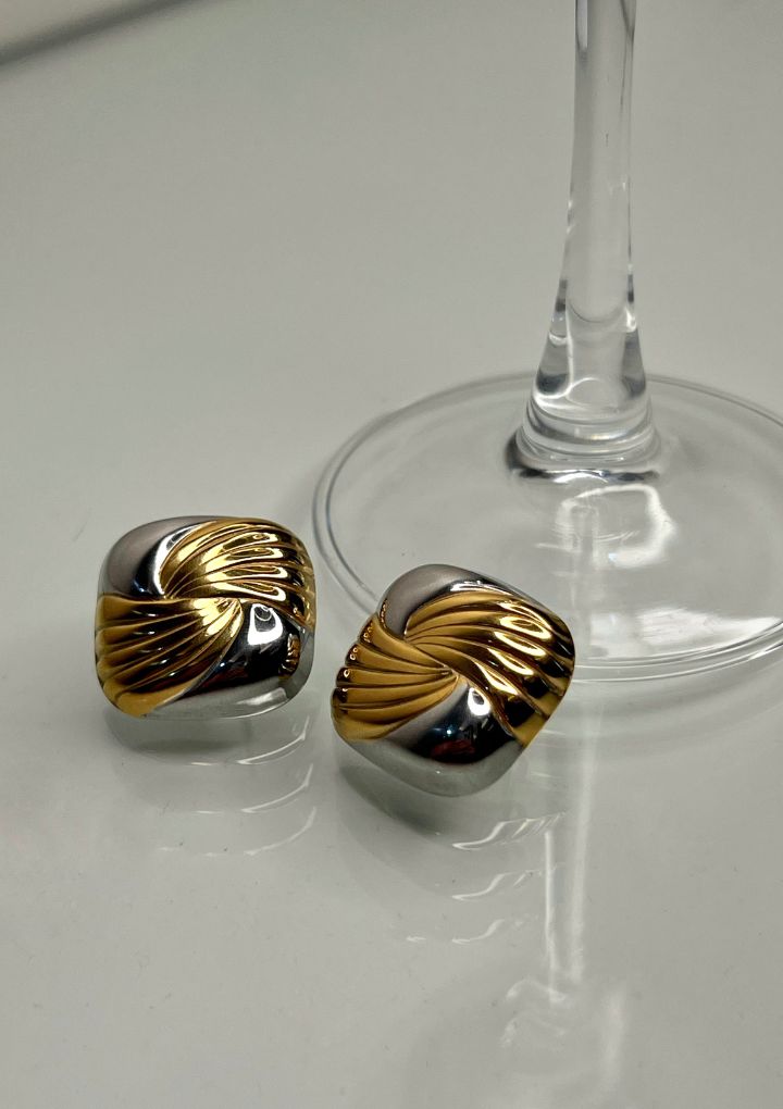 Our Maze studs feature a flawless square shape and a dual tone of polished gold and brushed silver. Perfect for a day-to-night travel.