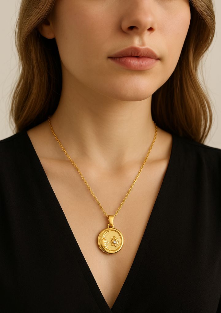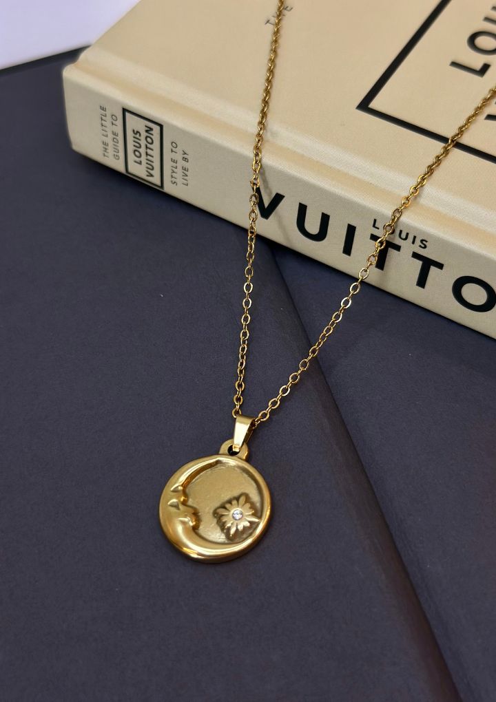 This is a gold necklace with a round pendant featuring a crescent moon. It is lightweight and perfect for everyday wear.