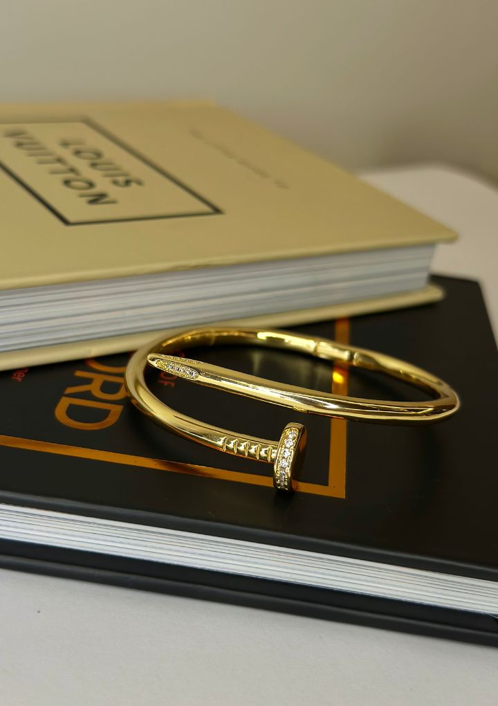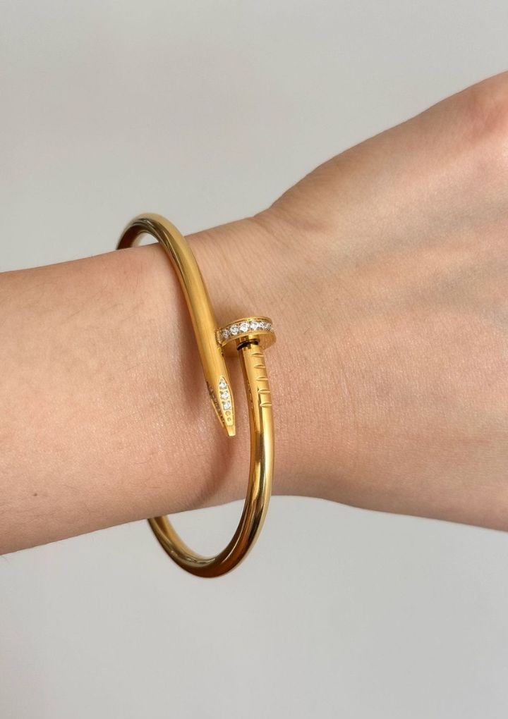 This gold-tone bracelet is sleek and shaped like a nail, accented with sparkling crystals. It is elegant and perfect for any occasion.