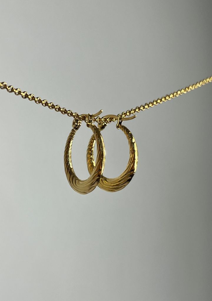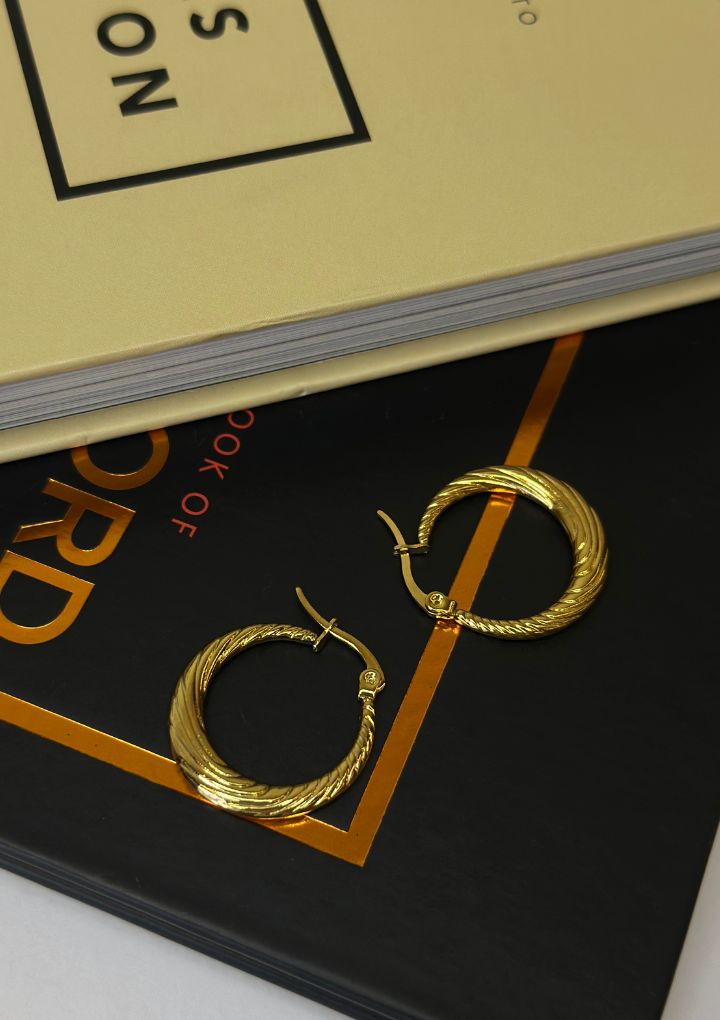 These are classic gold hoop earrings with a twisted, rope -like texture. Best to wear them anywhere and everywhere because they are lightweight and timeless.