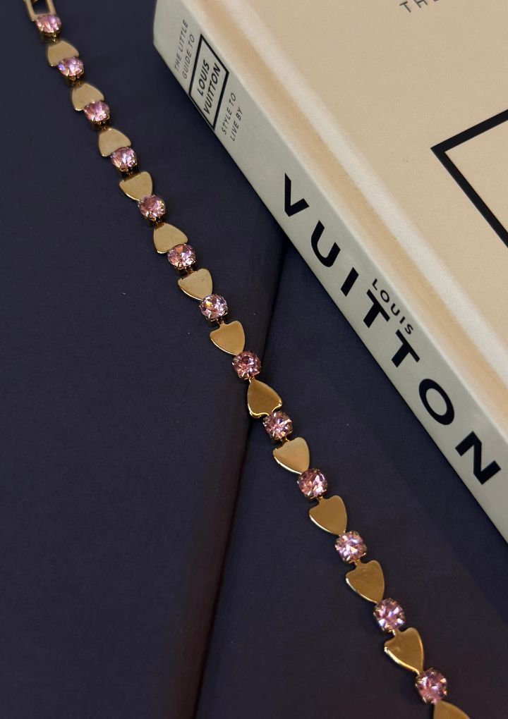 This is a delicate gold-toned bracelet with pink stones and heart-shaped links. It is soft, romantic and perfect for everyday stacking.