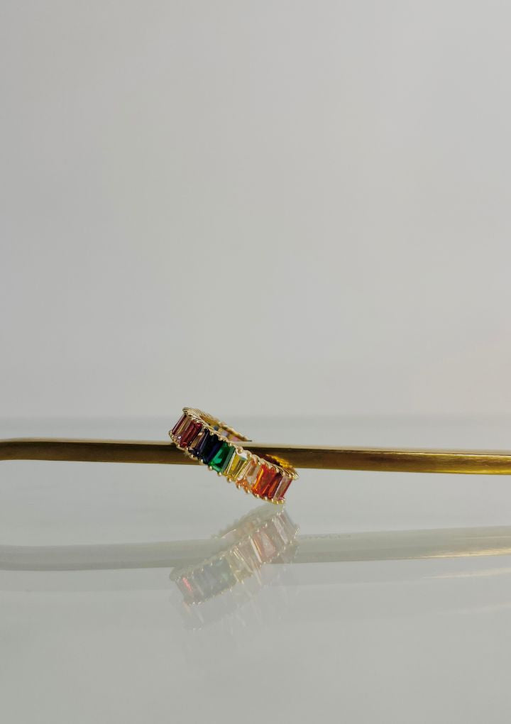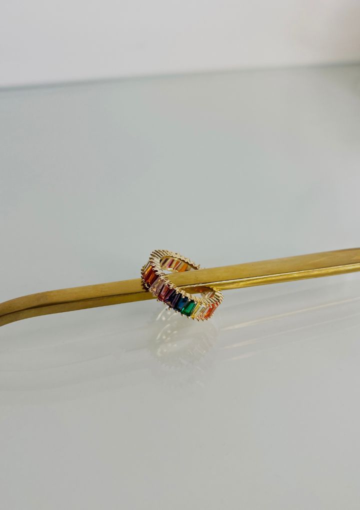 This is a gold band ring with baguette-cut rainbow gemstones arranged in a gradient, creating a colorful and elegant look. Perfect for lunch parties and vacation looks.