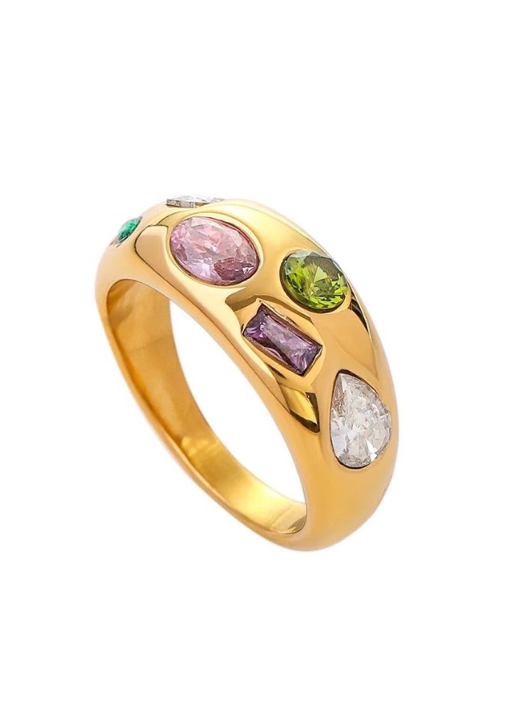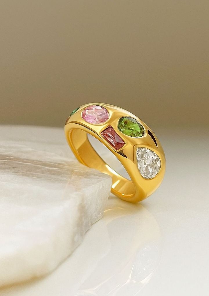 Rosy ring is a chunky gold ring adorned with colourful gemstones in unique cuts. It is playful, full of personality and will be your go-to for every vacation look.