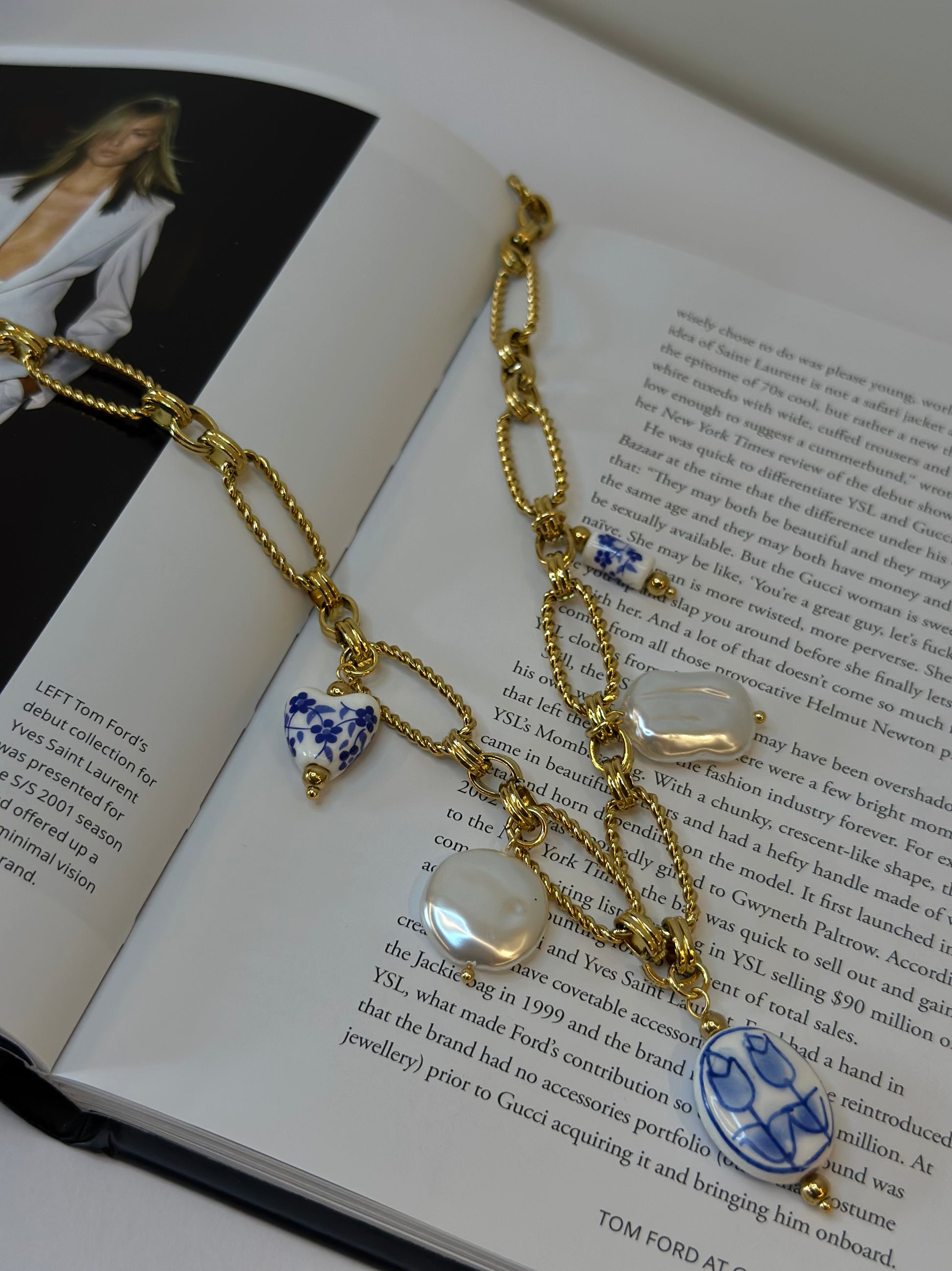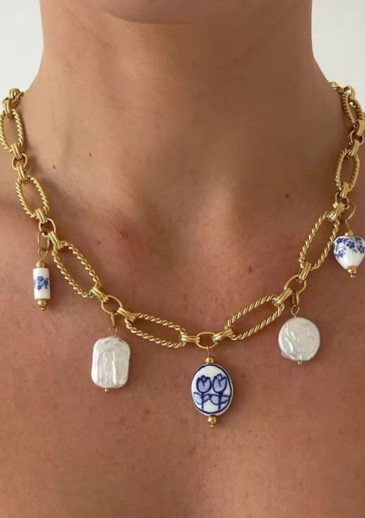 This is a chunky gold chain necklace featuring ceramic charms, pearls, and artistic blue-and-white accents. It is luxurious, trendy and will be your go-to for every holiday.