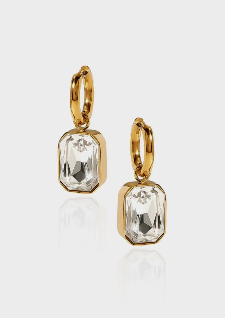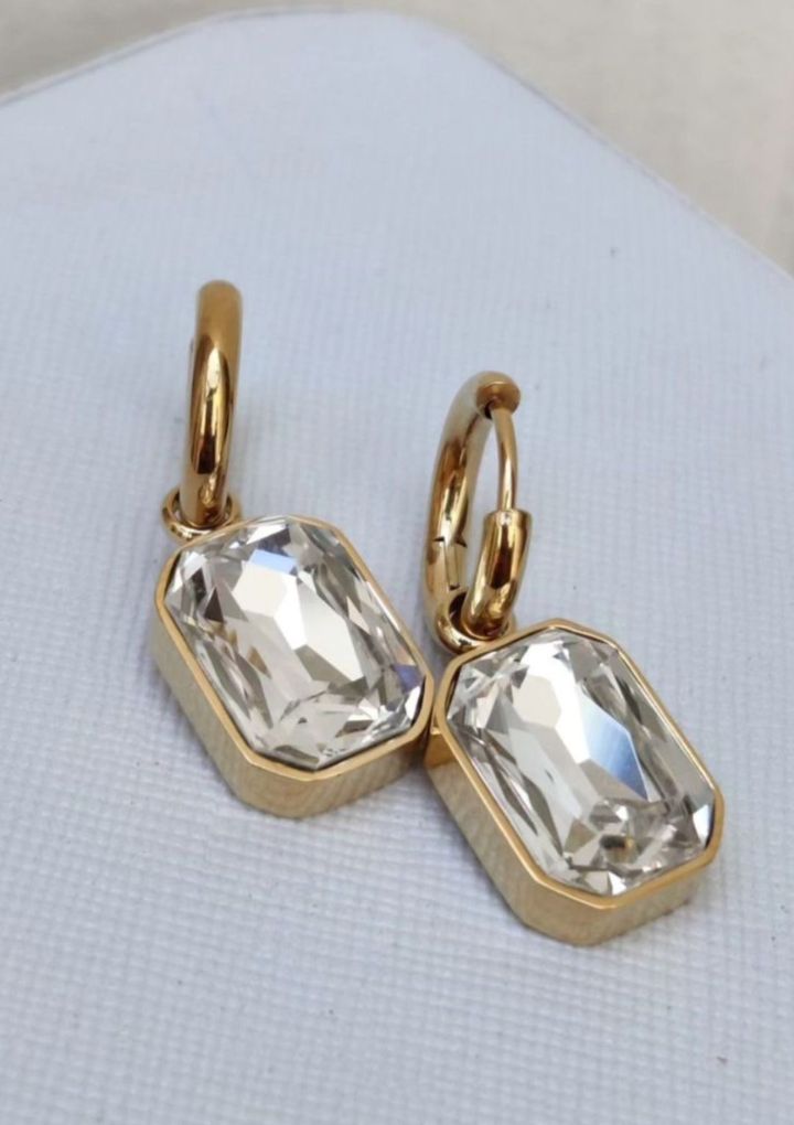 Self-love earrings are gold hoops featuring dazzling emerald-cut crystals. This pair will help you make a statement and let your jewellery do all the talking. Perfect for fancy dinners and party nights.