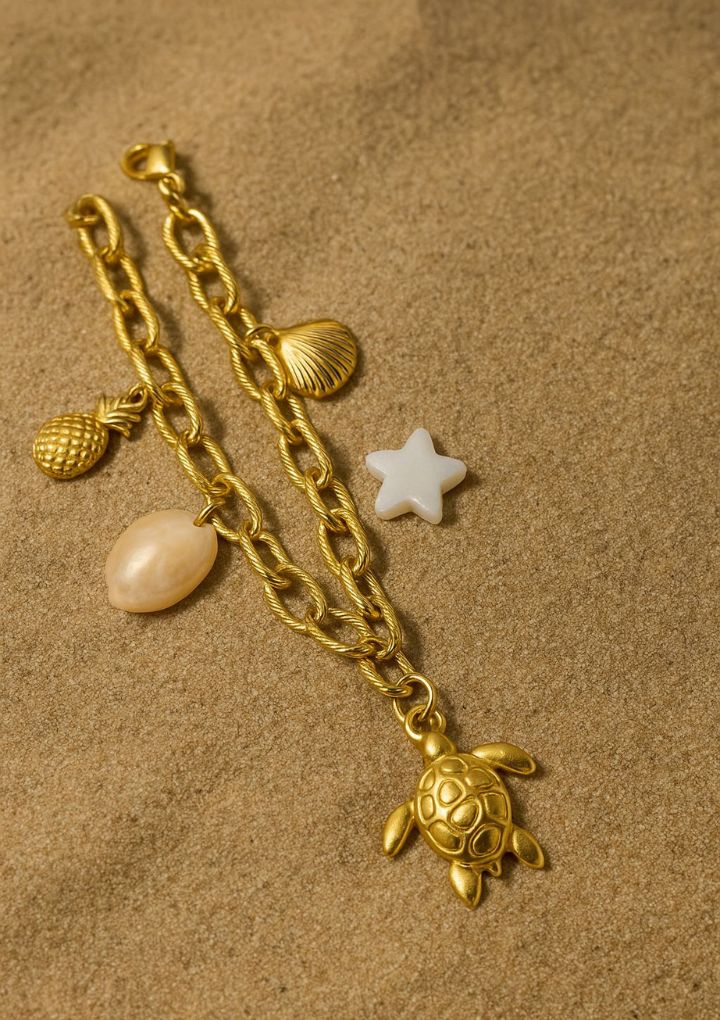 This is a chunky gold charm bracelet with tropical motifs—turtle, shell, pineapple, and bead. It is totally stackable and perfect for a beachy vibe.