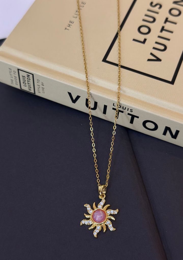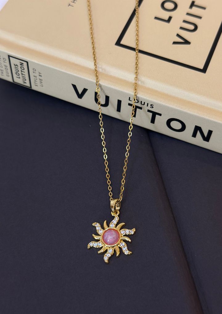 This is a gold chain necklace with a sun-shaped pendant featuring a pink center stone and sparkling white accents. It is perfect for layering on vacations and festive occasions.