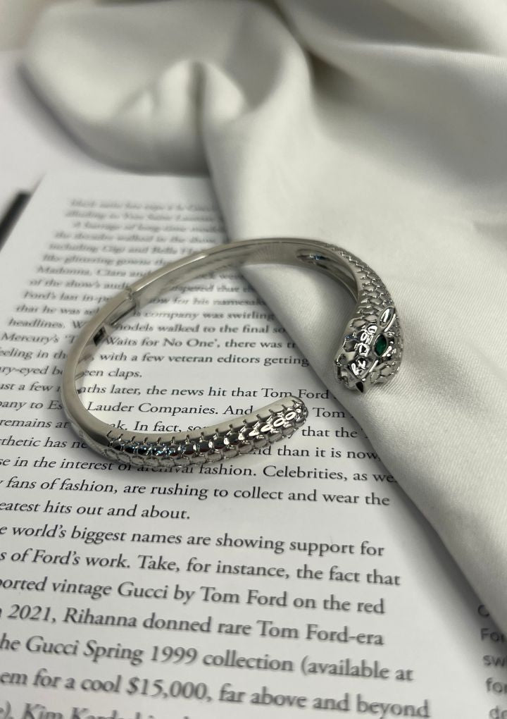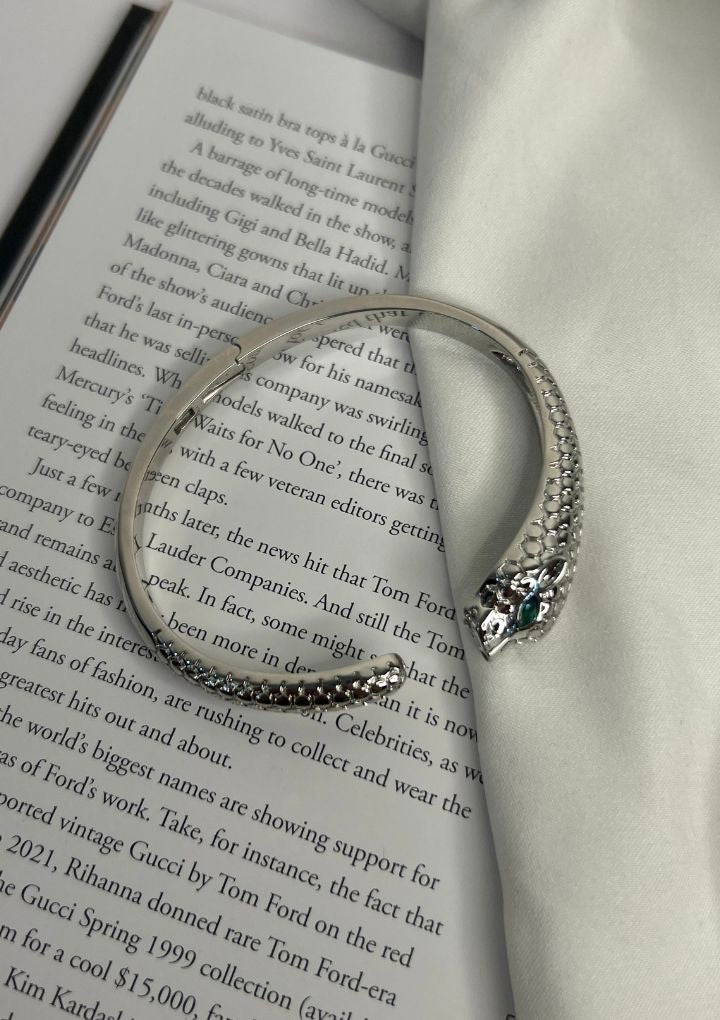 This is a silver-toned open cuff bracelet shaped like a serpent. Its scale-like finish and striking green gemstone eyes give it a bold, luxurious look that is perfect for your glam nights.
