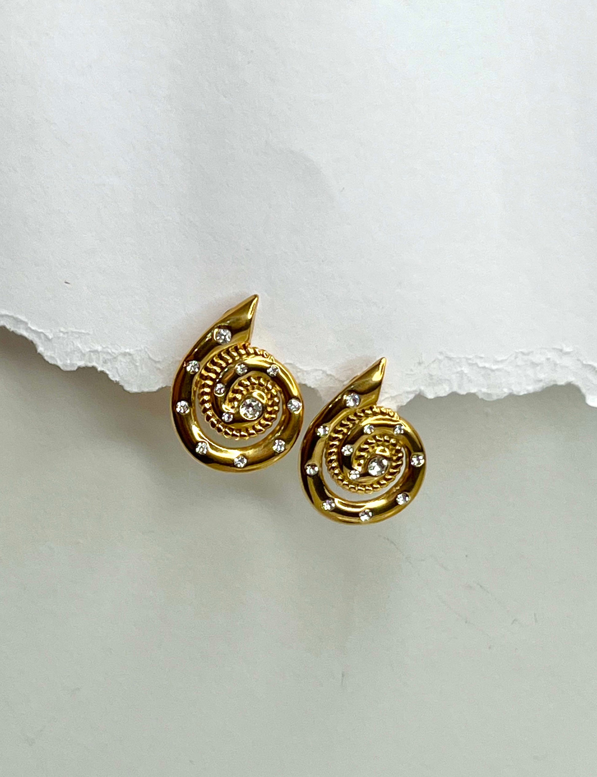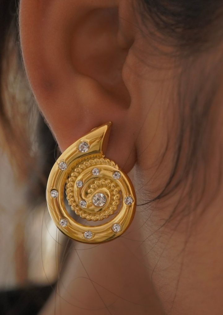 Whorl earrings feature a graceful spiral shape dotted with sparkling stones. These eye-catching beauties bring a modern, artful twist to any outfiit. Perfect for a lunch or dinner in a fancy dress.